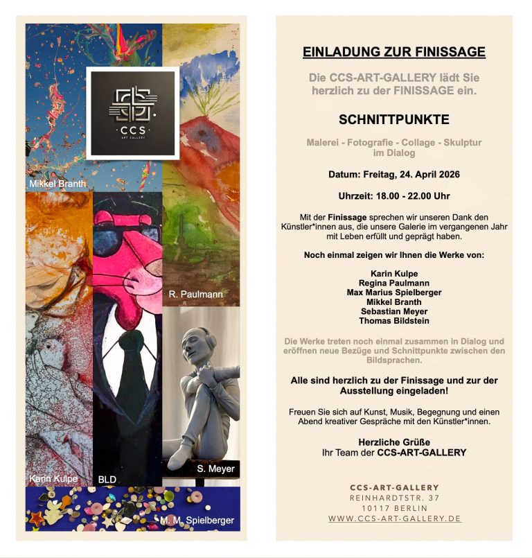 Willkommen bei CCS-ART-GALLERY, Ihrer Destination für zeitgenössische Kunst aus dem pulsierenden Berlin-Mitte. Entdecken Sie eine kuratierte Auswahl an Gemälden, Skulpturen, Fotografien und mehr von aufstrebenden und etablierten Künstlern.